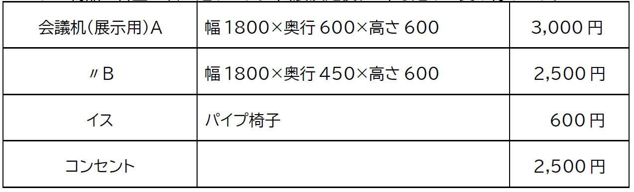 レンタル物品と料金は次の通りです。 出展決定後、お申し込みを受け付けます。